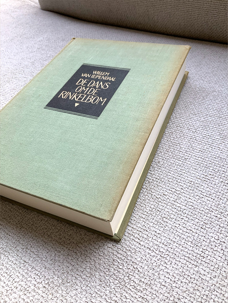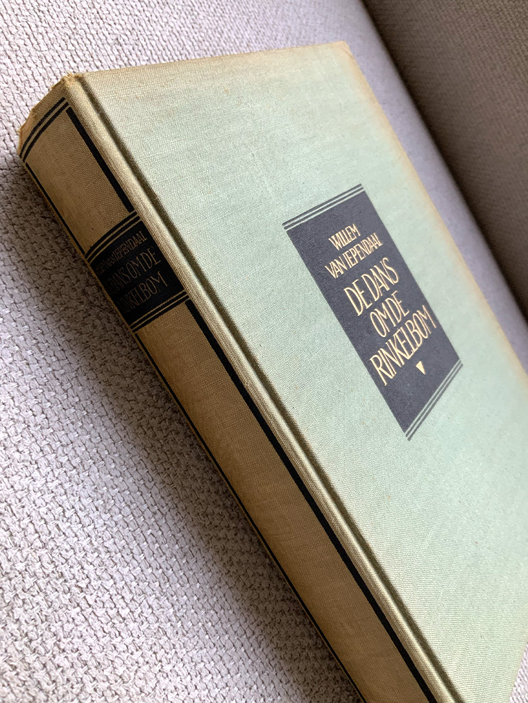 Een echte vintage kaft met subtiel verschoten kleuren, afgewerkt met een donkerblauw etiket en gouden letters.